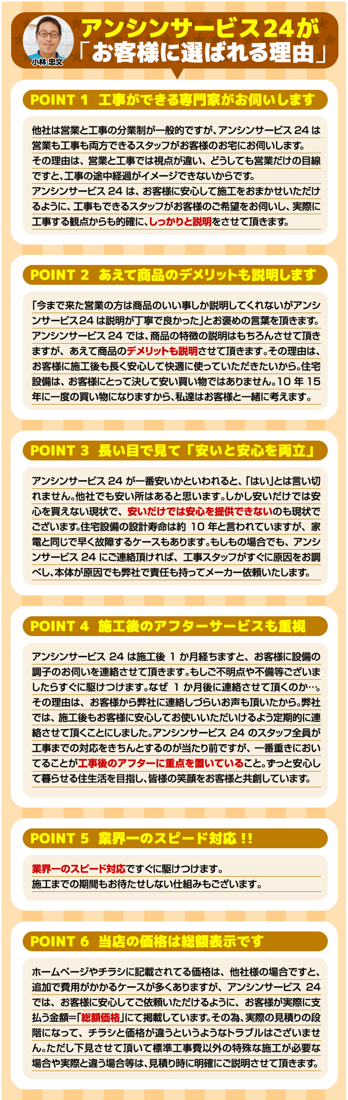 人気の工事ベスト3 レンジフード 食器洗い機 ガスコンロ キッチンリフォーム キッチン一覧 レンジフード 換気扇 システムキッチン 食器洗い機 ガスコンロ 蛇口・水栓 給湯器 アンシンサービス24 ご来店ありがとうございます!名古屋市の設備店 アンシンサービス24です。おかげさまで毎日元気に施工しています!住宅設備のことなら何でもご相談下さい! 住宅設備専門店 アンシンサービス24有限会社 〒463-0079 愛知県名古屋市守山区幸心2-302 アンシンサービス24が選ばれる理由 顧客サービス第一 ・名古屋の設備専門店 ・品質、丁寧な施工 ・誠実な見積り ・納期を守る ・懇切 丁寧な対応 ・お客様を大切にする会社 ・保証がしっかりしている プロが頑張っている後ろ姿を見てください! アンシンサービス24はどんな会社? 日本中の高齢者の暮らしを守りたい 住宅設備専門店アンシンサービス24は、小林忠文の「日本中の高齢者の暮らしを守りアンシンサービスのロゴの入ったクルマを500台走らせます!」という、壮大な夢に向かって創業しました。