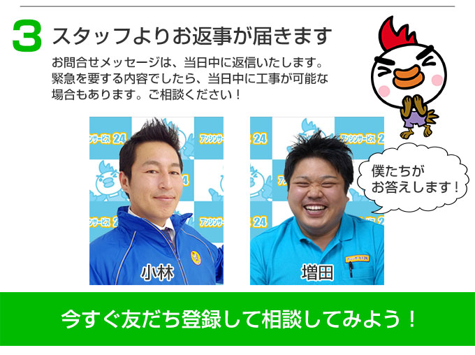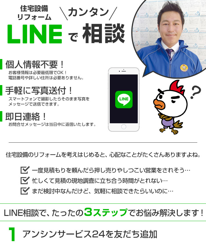 LINEお問い合わせ|キッチンリフォーム.COM キッチンリフォームのことならアンシンサービス24におまかせください!LINEからお気軽にお問い合わせできます。 LINE公式アカウントで簡単お見積り メッセージにコピーペーストしてご利用ください ■お名前 ■〇〇県〇〇市 ■ご相談内容 〇〇に困っていて取替工事をしたらいくら位かかりますか? 最短で取替工事はいつになりますか? アンシンサービスの特徴
